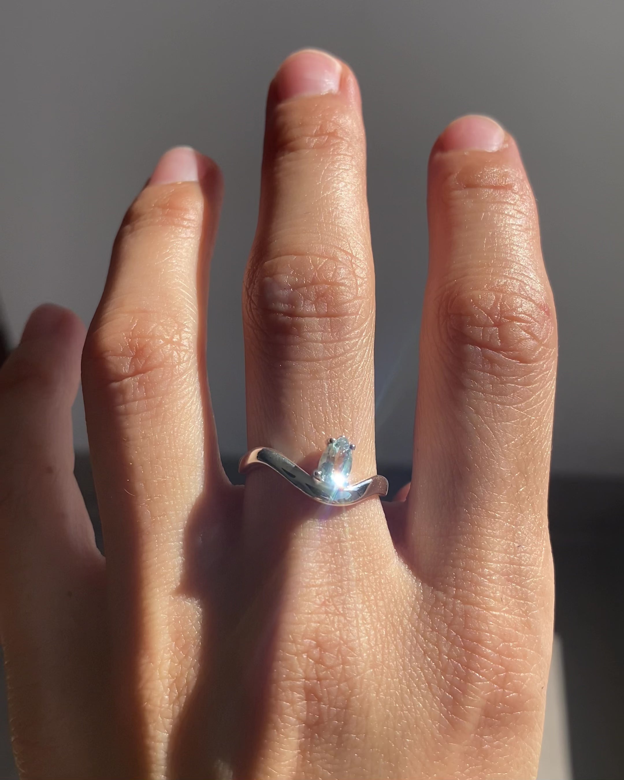 El anillo Awa está hecho a mano en plata 925 en talla 7 y lleva una gota de aguamarina natural.