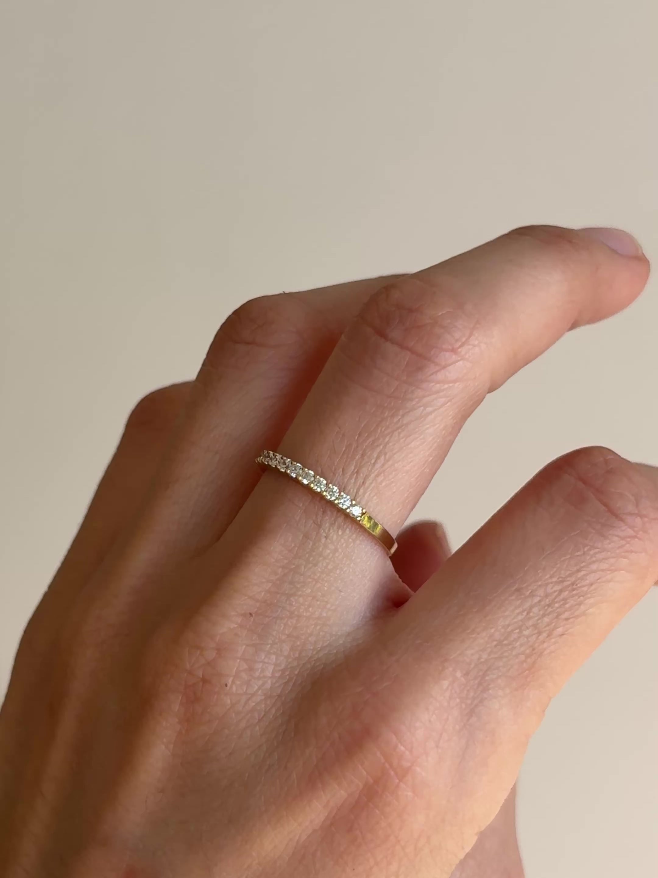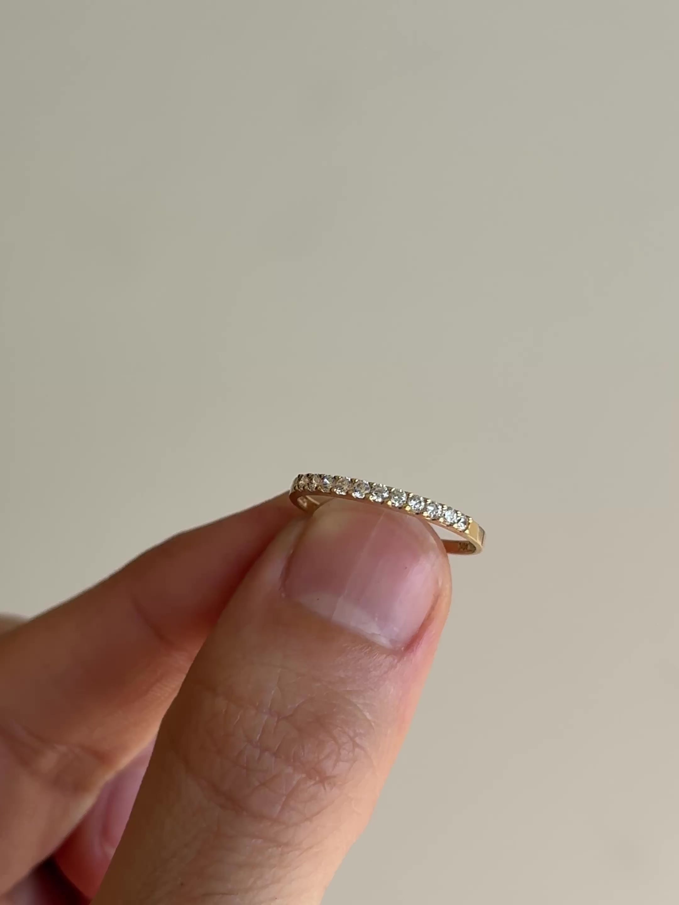 Pieza única hecha a mano en oro 14k y circones blancos de 1.7 mm, talla 7 (54 mm de circunferencia). El oro de 14k es ideal para anillos ya que posee mayor dureza que el oro de 18k y se marca menos.