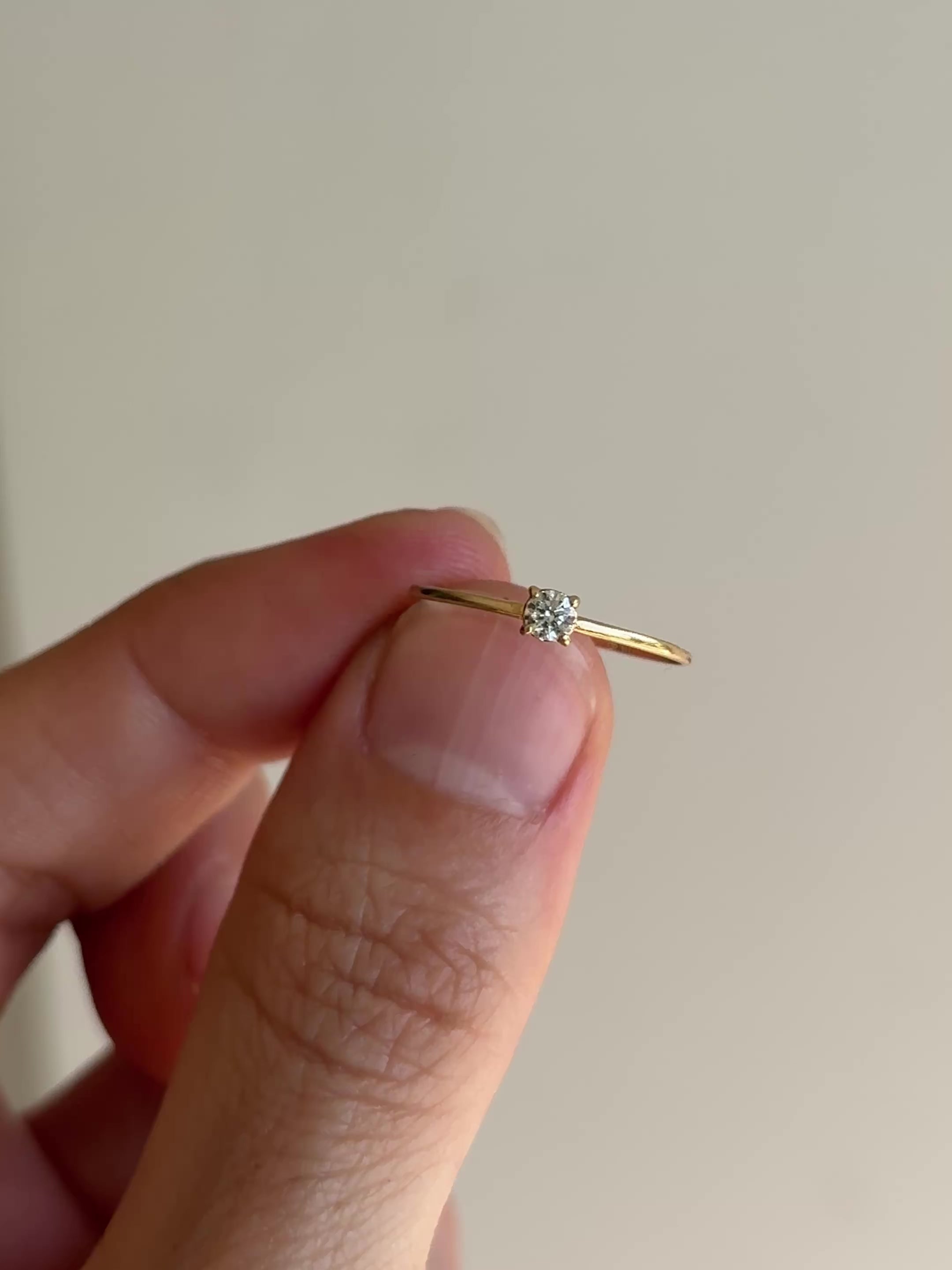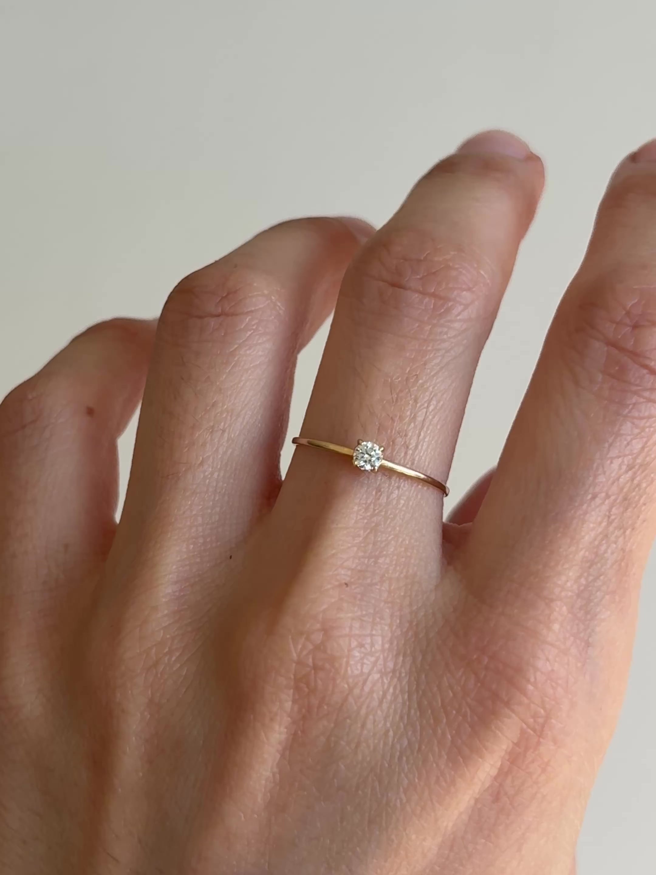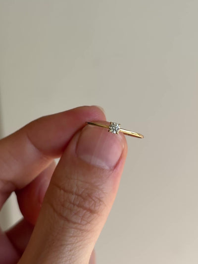 Pieza única hecha a mano en oro 14k, con un circón blanco de 3 mm. Talla 7 (54 mm de circunferencia). El oro de 14k es ideal para anillos ya que posee mayor dureza que el oro de 18k y se marca menos.