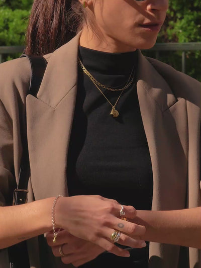El set 001 es un conjunto que contiene un collar Mini Orb enchapado en oro 18k de 40 cm, más un colgante Frank con onix negro natural y un colgante Medusa. Ambos colgantes pueden removerse de la cadena y combinarse con lo que quieras.